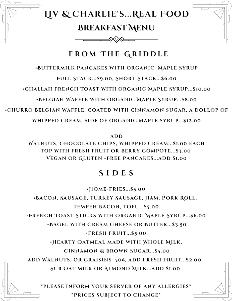 Welcome to Liv & Charlie's...Real Food, nestled in the heart of Lambertville, NJ. This charming eatery has captivated diners with its friendly atmosphere and a menu bursting with flavor. Customers rave about the freshness and quality of the food, from the mouthwatering pancakes and perfectly cooked challah French toast to the standout sausage, egg, and cheese bagels crafted with bakery-fresh bagels.